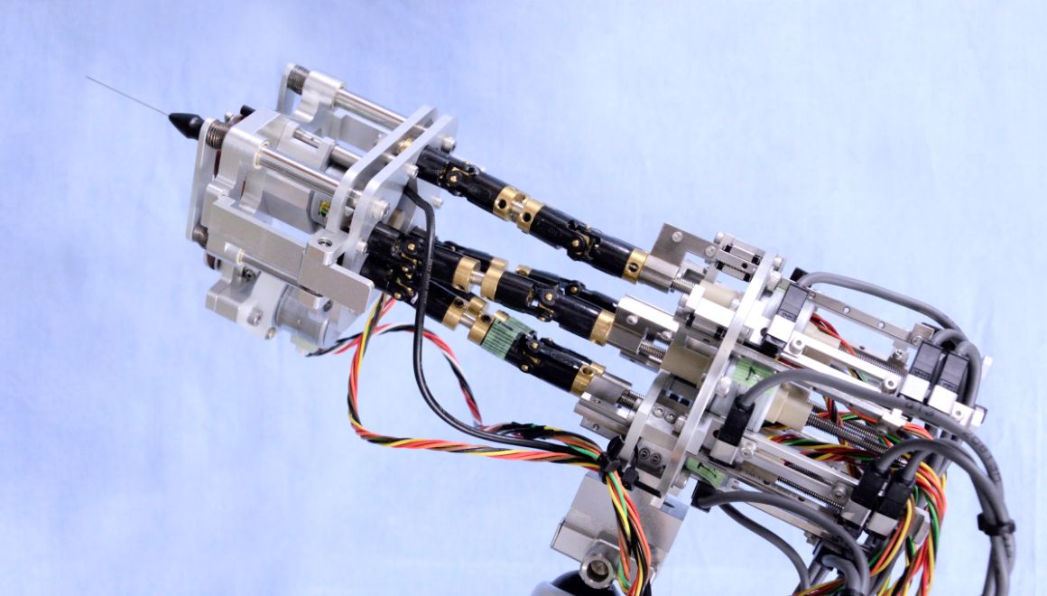 網膜・硝子体手術を支援する手術ロボットです。近年の医療現場では、顕微鏡等を用いた微細な手術が行われており、術者にも高い技量が求められます。本装置はマスタ・マニピュレータ(操作側)の操作量を40分の1倍にしてスレーブ・マニピュレータ(従属側)を動かすことで、手技を超えた手術精度を実現し、術者のサポートを目的として開発されています。