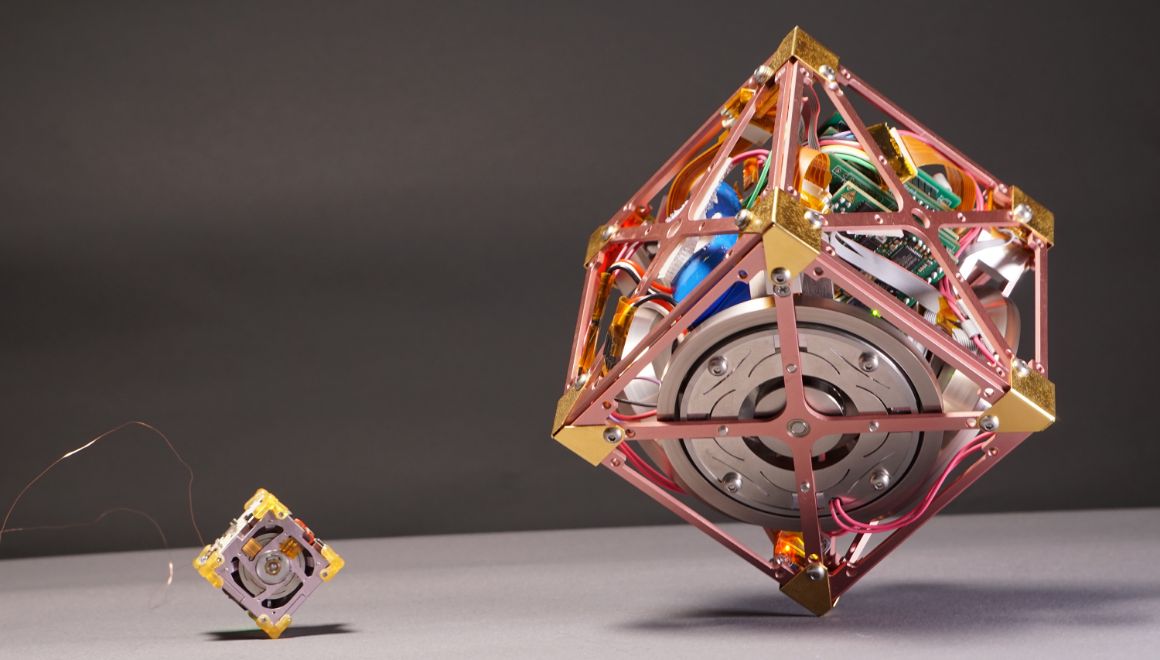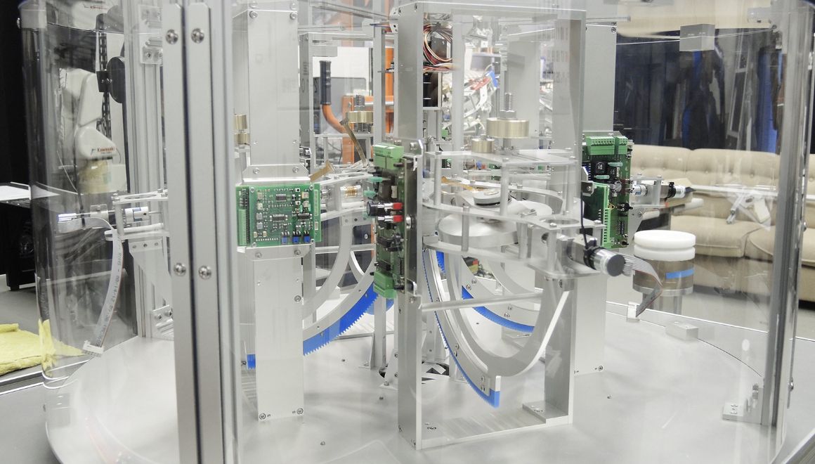コントロールモーメントジャイロ(CMG)と呼ばれる、角運動量の交換によって任意のトルクを発生させ、人工衛星の姿勢制御を行う機構の実験用装置です。CMGシステムは、一般的なリアクションホイールを用いた姿勢制御装置に比べて、より大きなトルクを発生することが可能ですが、トルクが発生しなくなる”特異点”と呼ばれるポイントが存在し、制御の際の深刻な問題となります。その特異点を回避する制御方法の研究に使用されています。